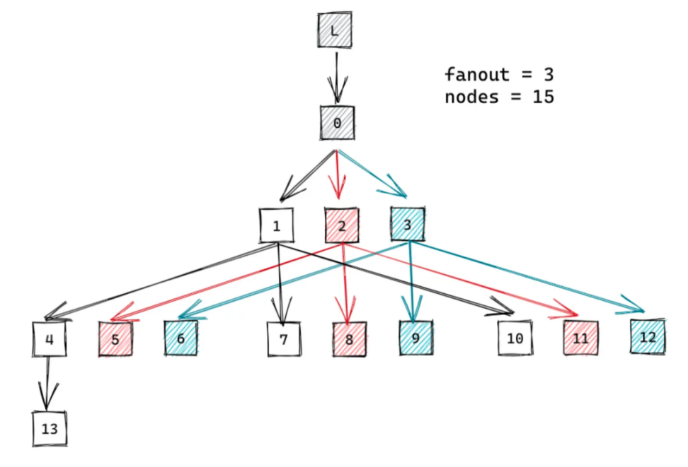 Solana 验证人将交易组织成称为“entries”的较小批次。在一个具有 15 个验证人的网络中,如果 fanout 大小设置为 3,领导节点最初会将数据广播到位于涡轮树顶部的特殊根节点。然后,根节点将数据与第一层中的三个节点共享。此层中的节点将数据进一步传输到下一层中的一部分节点。这个过程会持续下去,每个层中的每个节点都会将数据重新传输到下一层中的一个独特子集,直到集群中的所有节点都接收到所有数据碎片。