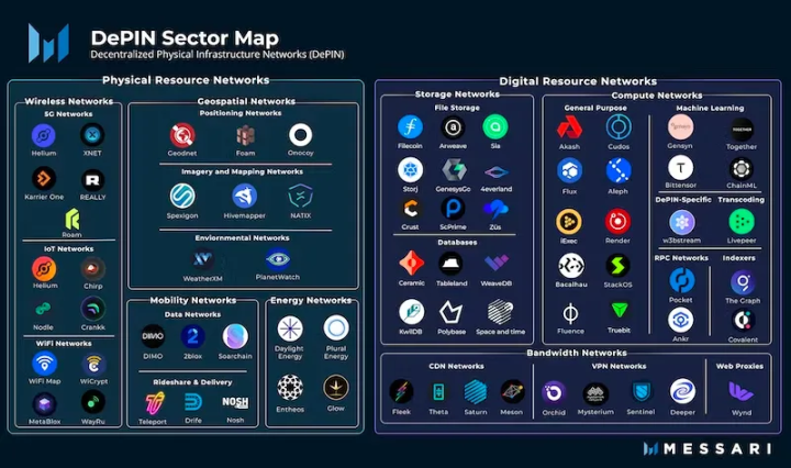 DePIN,即去中心化的物理基础设施,最初是由 Messari 在 2022 年末提出的。他们对其进行了清晰的定义,并基于他们的视角列出了景观。DePIN 分为两个主要领域:数字资源网络和物理资源网络。数字资源网络包括存储、计算和带宽,而物理资源网络侧重于与硬件相关的领域,如无线网络、地理空间网络、移动网络和能源网络。
