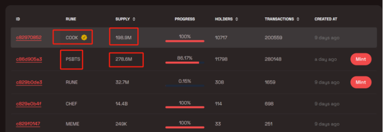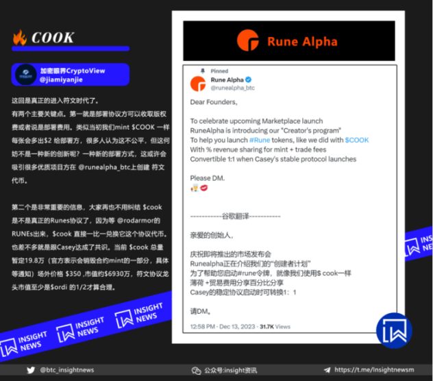当前 RUNE 协议上面的龙头是 COOK,总量 19.8 万张,mint 成本 15-30 刀一张,场外价格 400 刀一张,市值 7920 万美金。官方表示 $COOK 持有者会获得特别福利(持续赋能