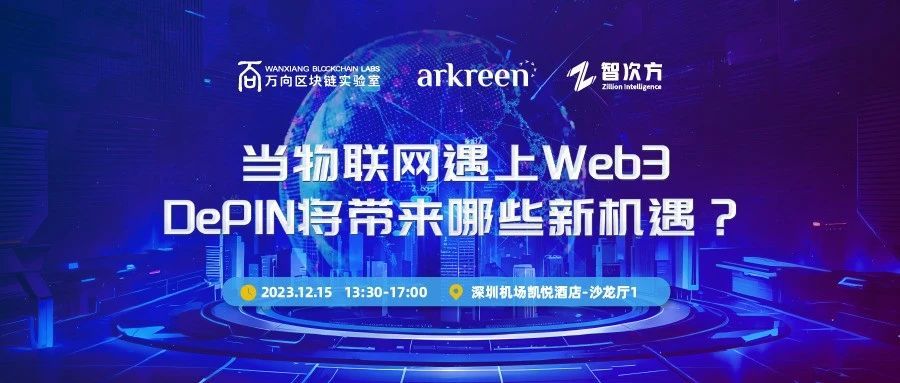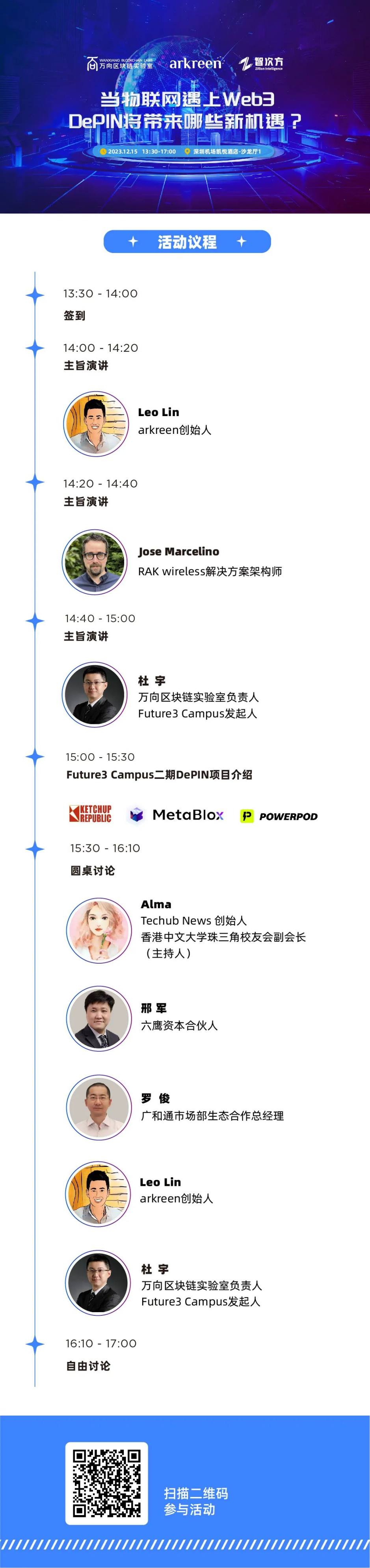 12 月 15 日(本周五)下午 13 点 30 分,由万向区块链实验室、Arkreen、智次方联合主办的“当物联网遇上 Web3,DePIN 将带来哪些机遇?”线下沙龙(后简称 DePIN 沙龙)将在深圳机场凯悦酒店沙龙厅 1 举办。点击阅读原文,即可免费报名 DePIN 沙龙!值得一提的是,“智能物联 中国 AIoT 产业年会暨 2024 智能产业前瞻洞察大典”也将与 12 月 15 日在深圳机场凯悦酒店举办,万向区块链将在主会场的活动现场设置展位,欢迎各位前往万向区块链展位了解最新的区块链产业应用。DePIN 沙龙将邀请到 Arkreen 创始人 Leo Lin、RAK wireless( 瑞科慧联 ) 解决方案架构师 Jose Marcelino、万向区块链实验室负责人 /Future3 Campus 发起人杜宇(按演讲顺序排列),以及 Ketchup Republic、MetaBlox、PowerPod 等 Future3 Campus 二期 DePIN 项目代表,通过分享 DePIN 领域的新兴项目与超前应用,探索物联网 +Web3 如何加速数字世界建设进程,帮助各行各业把握时代风口,顺利飞升数字世界。此外,香港中文大学珠三角校友会副会长 Techub News 创始人 Alma 将作为圆桌主持人,与六鹰资本合伙人邢军、广和通市场部生态合作总经理罗俊一同深入探索大湾区乃至全球范围内,DePIN 有哪些值得关注的发展机遇。2024 香港 Web3 嘉年华已定档 2024 年 4 月 6 日 -4 月 9 日,所有在 2024 年前购票的朋友们均可享特惠老友价!香港 Web3 嘉年华是由万向区块链实验室、HashKey Group 联合推出的 Web3 活动品牌,此前圆满落幕的首届香港 Web3 嘉年华活动持续四天,场地面积近 9000 平方米,周边活动超过 150 场,线下累计参与人数超过 50,000,超 300 位极具全球影响力的演讲嘉宾,超 100 家热门项目参展。