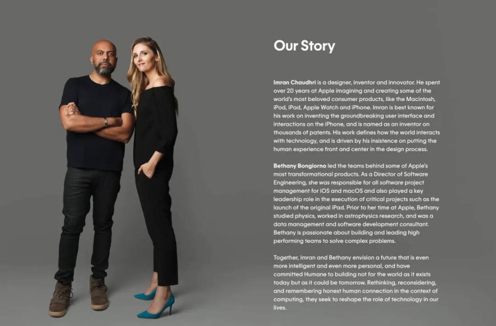 很多专业人士也质疑 Ai Pin 产品还没推出,就有了各式各样的新闻报道。科技圈经常有一项还没成型的产品和技术,目标直接就定在了——要改变世界。Ai Pin 本来准备 10 月推出,但还是延长到了 11 月,而这几天发布会的震撼效果,确实吸引了很多关注者拿它和苹果公司对比。Humane 的创始人与苹果公司有着深厚的渊源,创始人 Bethany Bongiorno 和 Imran Chaudhri 都曾是苹果公司的员工,这些给他们创业加持了一些光环。