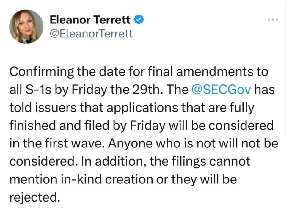 「我们确认 29 日(周五)为对所有 S-1 申请进行最终修订的日期。@SECGov 已告知发行人,在周五之前完成并提交的申请将在第一波中得到考虑,否则将不予考虑。此外,申报文件不得提及实物赎回,否则将被拒绝。」