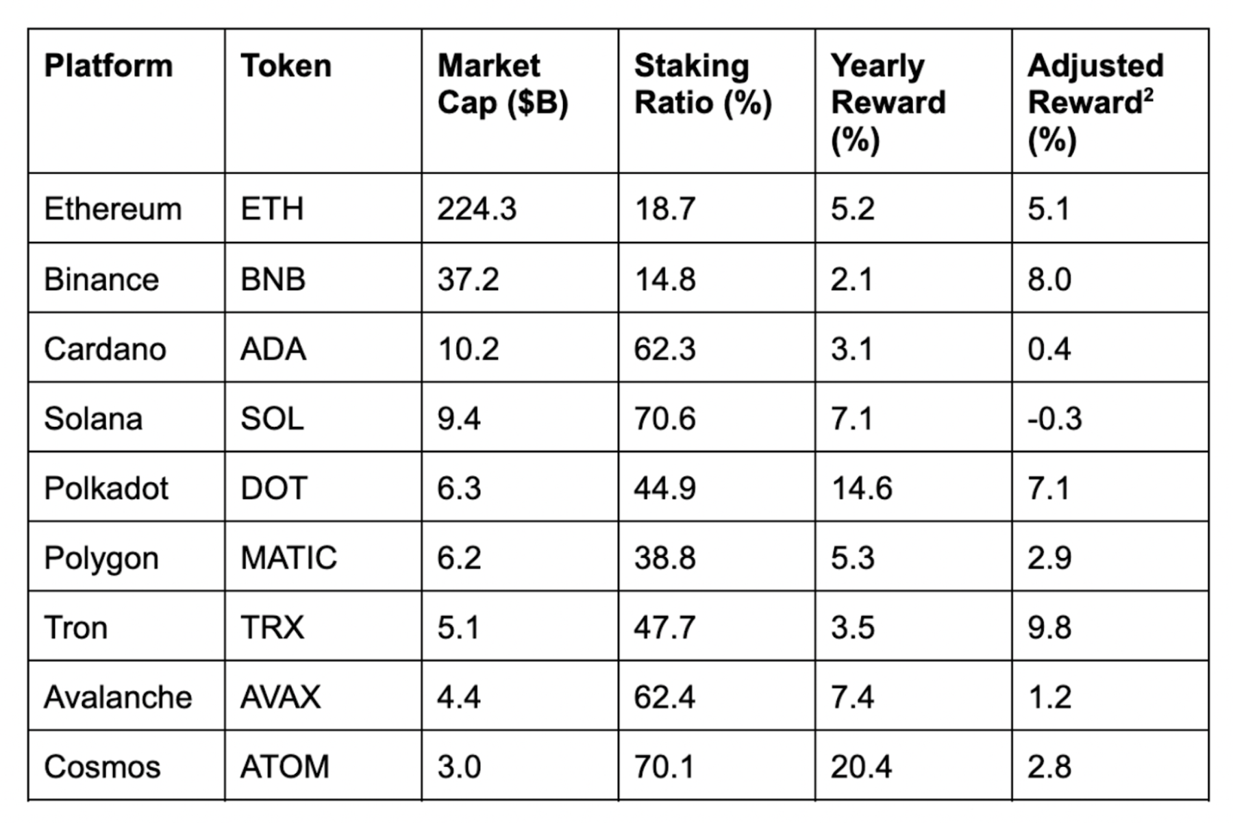 [1] 读者可以查阅 stakerewards.com 网站了解表中各列的定义。由于不同平台间存在各种差异,可能需对这些数字持保留意见,应将其视为指示性的数据。