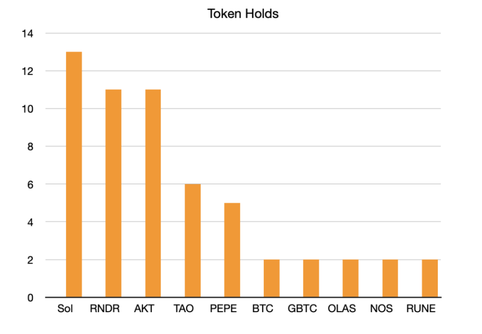 下图为 Messari 分析师目前的持仓代币分布图(已去除出现次数仅 1 次的币种)。分析师们的主要持仓币种和 2023 年涨幅最大的持仓币种类似,仍然集中分布在 Solana 与 AI + DePIN 概念中。有意思的是,对于分析师们强烈看好的其他赛道,例如 DeSoc、DeSci、Perps 等,分析师们并未持有任何相关的代币。