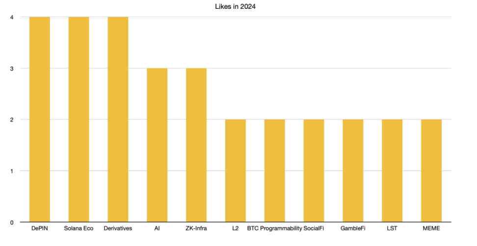 下图为 Messari 分析师喜欢的赛道(已去除出现次数仅 1 次的赛道)。和此前的情况类似,依然是 Solana 与 DePIN 概念占据主导。但是去中心化衍生品超越了 AI 成为了分析师们最喜爱的赛道之一,ZK 概念也也来到了与 AI 平起平坐的重要等级。