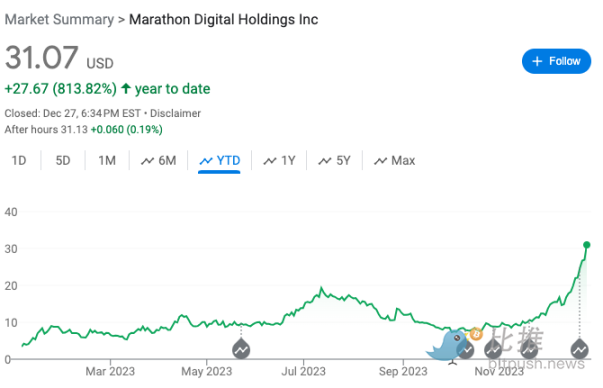 虽然比特币年内上涨超过 150%,但与加密货币密切相关的股票表现更好,Marathon Digital、Coinbase、MicroStrategy 和 Grayscale Bitcoin Trust (GBTC)在 2023 年的涨幅均超过 300%。其中比特币矿企 Marathon Digital 年初至今涨幅近 8 倍。