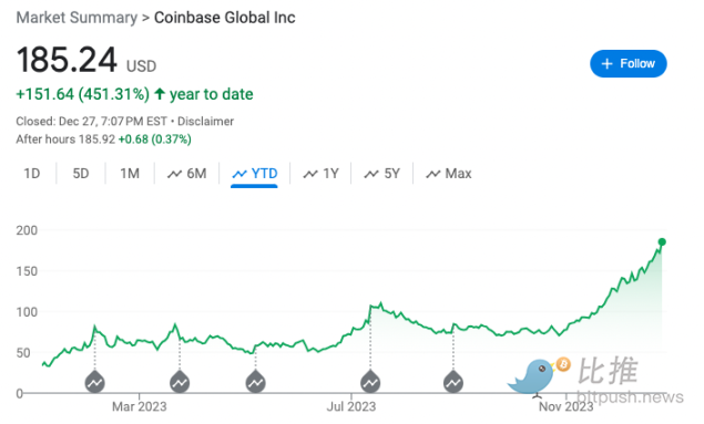 在矿业领域之外,今年美国表现最好的加密股票是 Coinbase,年初至今已飙升 450%。
