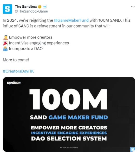 11 月 3 日,我们在香港全球创作者日上宣布,The Sandbox 已为所有创作者分配了 100,000,000 SAND,将通过 GMF 进行分发。作为首次启动的建设者挑战,我们准备了专门的 SAND 参与池,将提供给在 The Sandbox 中发布最吸引人体验的创作者,具体细节即将公布。参与池是我们 2024 年 GMF 模型的第一步。明年晚些时候,GMF 将与 The Sandbox DAO 密切结合。