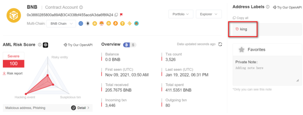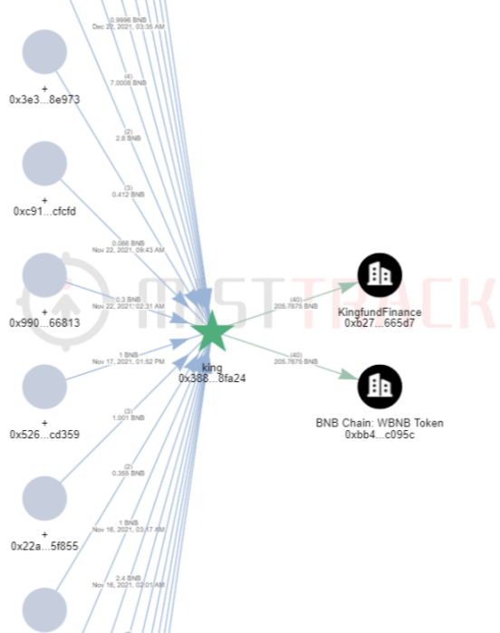 我们发现这个恶意合约在 MistTrack 里被标记为 King,也就是说这个合约地址是原来项目 King 的合约地址,该合约地址与 Kingfund Finance 也存在交互,King 和 Kingfund Finance 应该是同一个项目:
