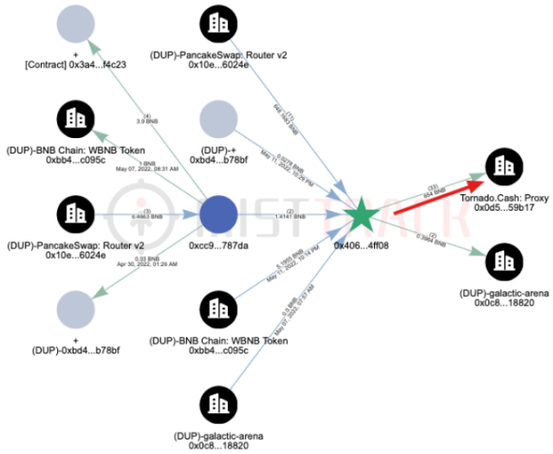 该恶意合约的创建者 (0x406119D496a3b0D1F0B7DA020B5e89d6FFf4Ff08) 已将大部分获利资金转移到 Tornado Cash。