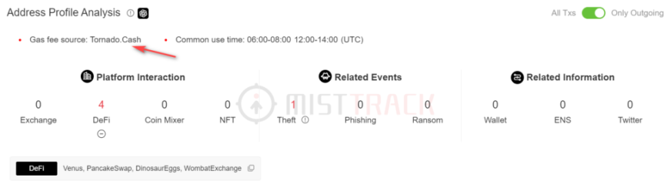 黑客初始资金来自 Tornado Cash 转入的 0.098 BNB,且使用过 Venus, PancakeSwap, DinosaurEggs, WombatExchange: