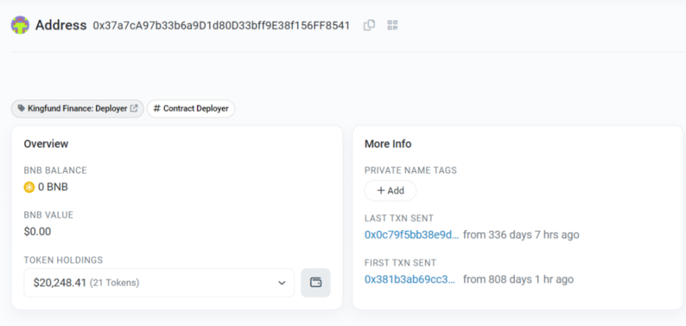 再看下恶意合约地址的创建者地址 (0x37a7cA97b33b6a9D1d80D33bff9E38f156FF8541) 被标记为 Kingfund Finance: Deployer。