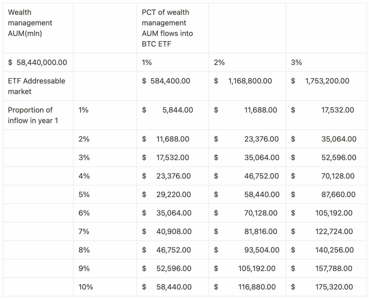 通过非常保守的类别黄金和使用 58440bln 的财富管理 AUM 中的 1% 流入 BTC 的方法进行估计,预计 BTC 现货 ETF 通过后第一年流入资金在为 54 亿 -290 亿美元左右。