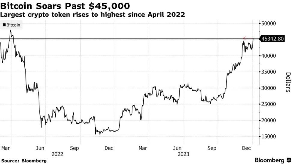 据彭博社报道,随着人们对比特币现货 ETF 获批预期提升,比特币在近两年来首次突破 45000 美元。在 2023 年大涨 160% 之后,成为今年表现最好的资产之一。
