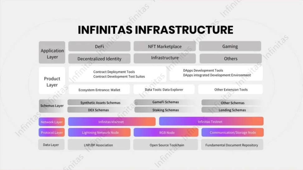 Infinitas 是最早开启基于比特币构建图灵完备的智能合约赛道的项目之一,作为揉和 RGB 协议和闪电网络的比特币应用生态网络,旨在实现更高的隐私保护、卓越的吞吐量和出色的低延迟交易处理。Infinitas 作为一项创新的区块链解决方案,自 2021 年起夯实基于 RGB 的比特币图灵完备智能合约想法,充分发挥了比特币的安全性和共识机制,允许在比特币网络上创建更复杂的应用程序和智能合约,希望为用户带来卓越的交易体验。项目技术核心由比特币底层部分代码建设者,最早关注到 RGB 协议且进行翻译相关工作的 Top 级区块链科学家团队带领。Infinitas 将优先提供 Online IDE,数据浏览器,接入主流钱包等方式让开发者和用户参与到生态中,真正支持 RWA 和全链游戏等大体量商业应用的落地。全网哈希算力保护:继承了比特币区块链的高安全性,确保了 Infinitas 资产在比特币区块链中得到全网哈希算力的保护,增强了资产的安全性。更高水平隐私保护:实现了 Infinitas 资产的更高水平隐私保护,并引入了无需信任的比特币锚定机制,进一步加强了用户隐私。适配器技术:通过 Infinitas 适配器技术,用户可以实现对比特币完整状态的了解,增强了对资产状态的感知能力。丰富全局状态:通过完善和扩展 RGB 的全局状态(Global State),为虚拟机和客户端(如钱包等)提供访问接口。尤其在智能合约地址的信任方面进行特殊加强,从而关键性地支持了在 RGB 生态系统中构建复杂的应用程序。这一举措还使得不同系统能够相互理解和解释各自的状态,进一步推动了整个生态系统的发展。优化闪电网络:通过对闪电网络的改进(如轻区块技术、节点自动扩容技术以及离线时的自治能力),实现了更高的交易吞吐量,同时保持低延迟的交易确认时间。开发者友好:使用 Rust 语言,以 Schema 层作为开发基建,可以让普通人都参与到开发中。