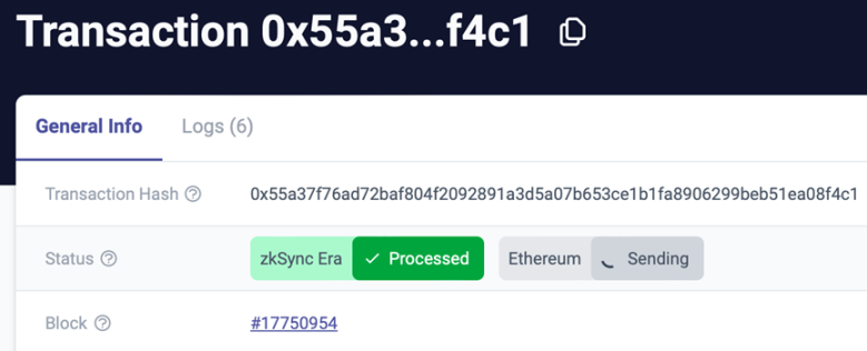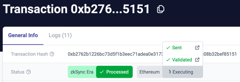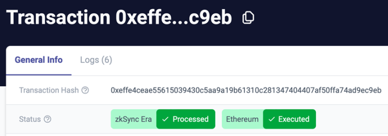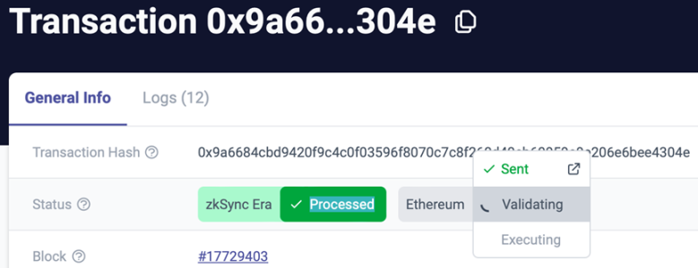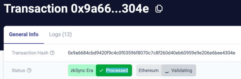 在 zkSync Explorer 上看到的交易也会包含 Pre-Confirmation 的交易,像是下面截图中的这一笔交易,可以看到 Status 目前是 zkSync Era Processed,表示已经被 Sequencer 排进 L2 区块里: