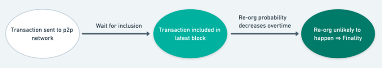 用户发出交易并签名后,就会发送到 p2p 网络当中,并等待PoW 共识机制下的 Miner 或 PoS 共识机制下的 Proposer 将他的交易收入到区块中。当用户发现他的交易被收入到最新一个区块中时,还不能百分之百确认交易一定会写入该条区块链的历史中,这是因为区块链可能会发生被称为「Re-org」的情况,用户必须历经等待,等到某个区块发生 Re-org 的机率足够低的时候,才能确信交易会被写入区块链的历史中。