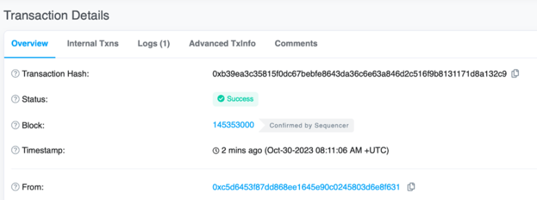 在 Arbitrum Explorer 上看到的交易会包含 Pre-Confirmation 的交易,也就是还未上传到 L1 的交易,如下图所示的这一笔交易,可以看到 Block Number 145353000 旁边有一个 Confirmed by Sequencer 标示: