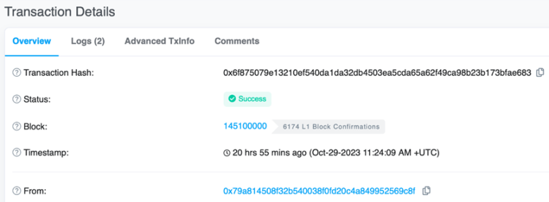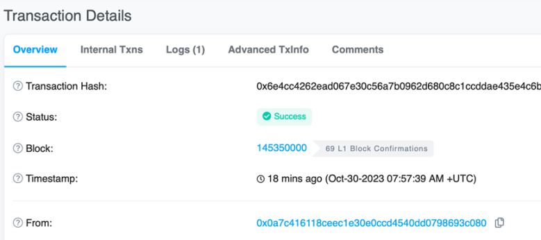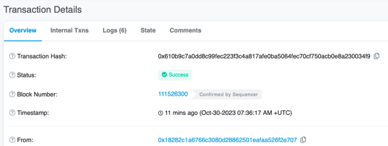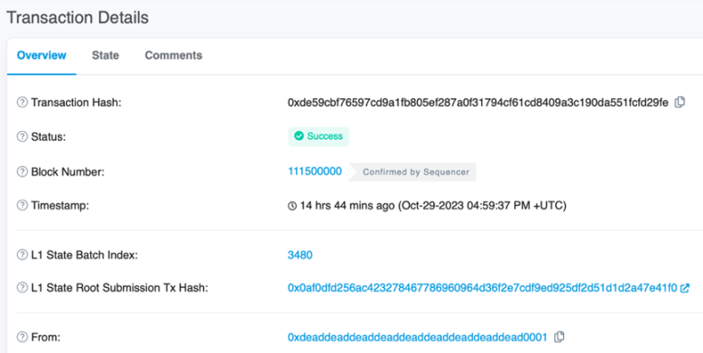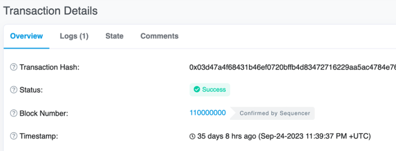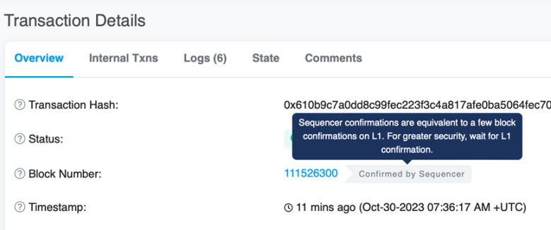 不过目前该 Explorer 似乎没有明确规范 Confirmed by Sequencer 的含义,它说「Sequencer confirmations are equivalent to a few block confirmations on L1.」,表示 Confirmed by Sequencer 代表的是已上传到 L1 且已经有数个区块接在后面了: