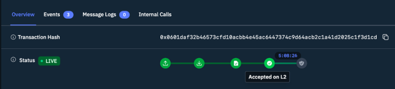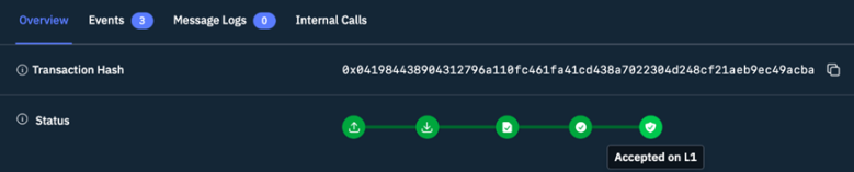 在 Starkscan 这个 StarkNet Explorer 上看到的交易也会包含 Pre-Confirmation 的交易,如下图所示的这一笔交易,可以看到 Status 目前是 Accepted on L2,表示已经被 Sequencer 排进 L2 区块里: