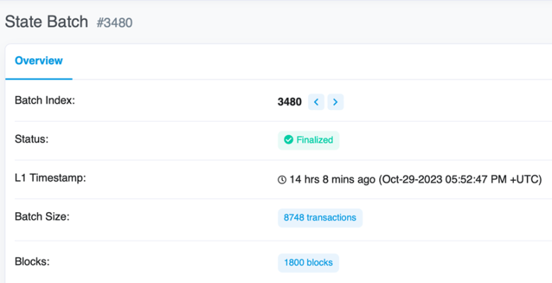 点进 「3480」这个 State Batch,可以看到它的状态是 Finalized,这个 Finalized 对应到的是 L1(即 Ethereum 主网)的 Finalized 状态,是已经顺利累积两个 Epoch 验证者投票的、非常安全的状态。