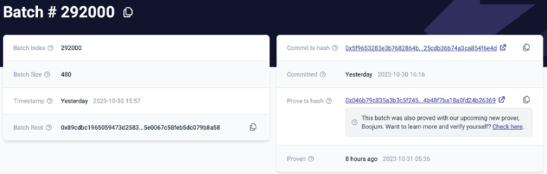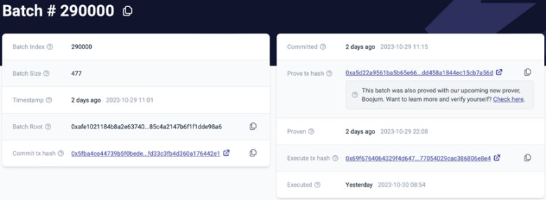 并且,zkSync Explorer 针对不同阶段都提供了丰富、完整的数据展示,任何人都可以通过 Explorer 掌握交易最新状态,甚至能够亲自去验证每一个阶段转换(例如从 Committed 到 Proven、从 Proven 到 Executed)的交易执行。