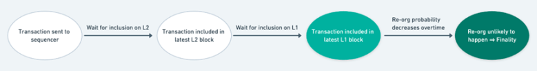 用户先等待交易被收入 L2 区块中,再等待 L2 区块透过一笔 L1 交易上传到 L1,最后再等待 L1 交易被 Finalized。