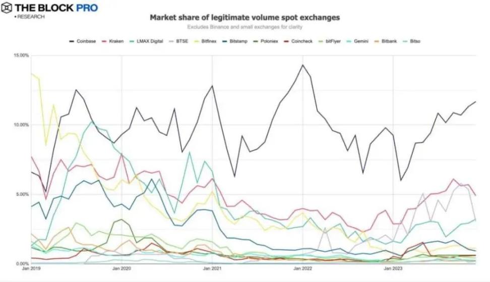 7、12 月各大加密货币交易所的现货市场份额排名如下:币安为 72.3%、Coinbase 为 11.7%、Kraken 为 4.9%、LMAX Digital 为 3.2%。
