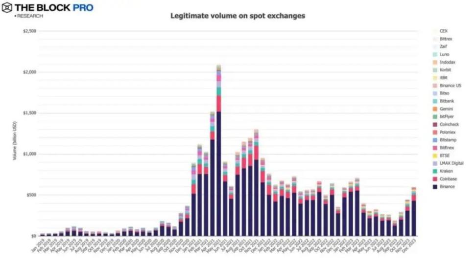6、合规中心化交易所(CEX)的现货交易额在 12 月份继续表现上涨态势,涨幅达到 34.5%,升到约 5987 亿美元。