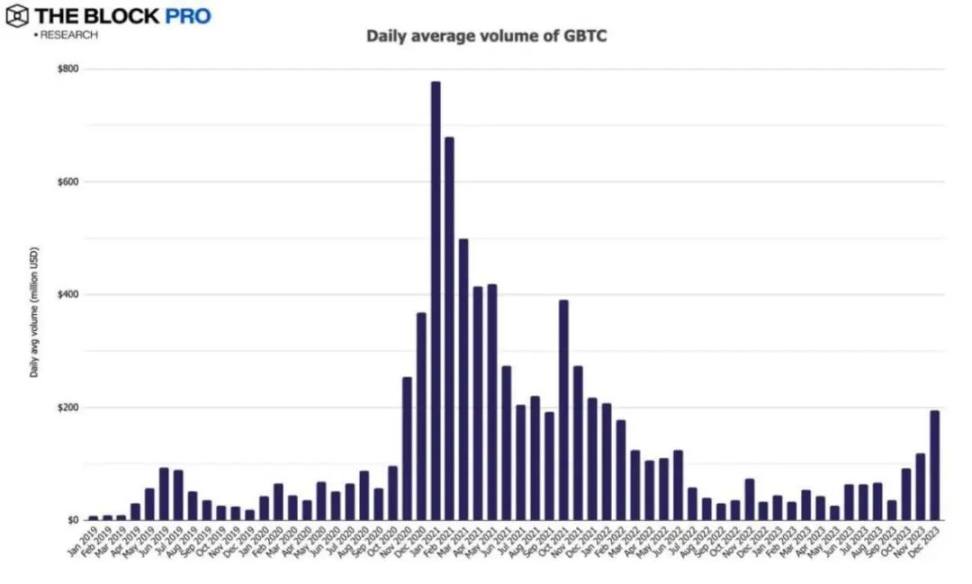 8、灰度的比特币信托基金 GBTC 的日均交易额在 12 月份上涨达到了 63.4%,升至 1.95 亿美元。