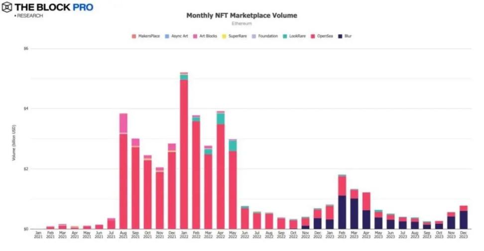 5、12 月以太坊链上 NFT 市场交易额出现较大幅度的上升,达到约 7.8 亿美元,涨幅高达 39.8%。