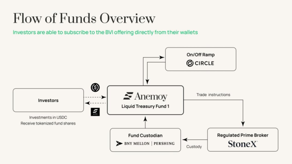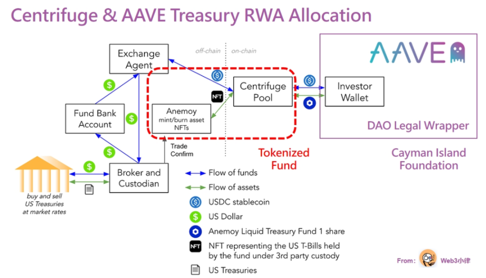 Anemoy LTF 是注册在 BVI 的基金,首先通过 Centrifuge 协议将该基金代币化;然后,Aave 将金库资金投资于 Anemoy LTF 对应的 Centrifuge 资产池中,并产生的基金代币凭证;之后,Centrifuge 资产池通过协议将 Aave 金库投入的资产分配到 Anemoy LTF 基金手中;最后 Anemoy LTF 基金通过出入金、托管、经纪商买入美国国债,实现美债收益上链。