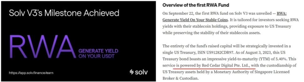 例如我们看到市面上非常成功的链上基金项目——Solv Protocol,在其 V3 版本推出了两只 RWA 基金,由 Solv RWA 作为基金管理人,目前管理合计 200 万美金 TVL 的资产,通过 KYC/AML 的合格用户可以存入稳定币享受美债的收益。根据其新闻稿,该 RWA 基金的底层资产为 Red Cedar Digital. Ltd. 提供的代币化美债。