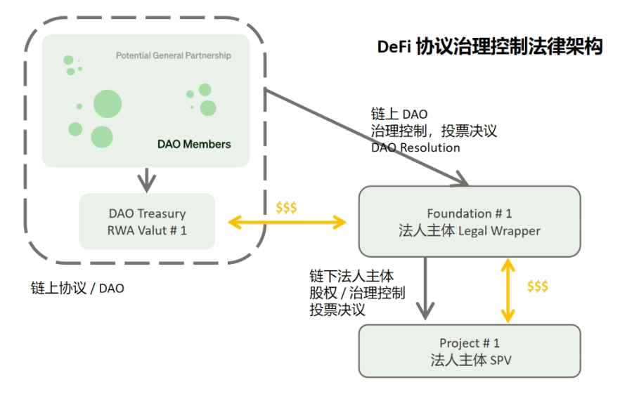 因此,就非常有必要通过法律包装(Legal Wrapper)的方式,为链上协议或 DAO 组织搭建治理体系和法律架构,并通过 DAO 治理与法人主体治理体系的打通,实现 DeFi 对链下资产的治理控制。