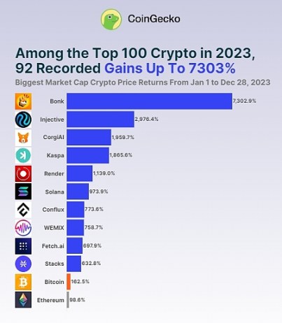 比特币 (BTC) 的表现优于前 100 名加密货币中的 65 种代币,自年初到 2023 年 12 月 28 日,从 16,540 美元上涨到 43418 美元,增长了 162.5%。这表明从该组中随机选择一种加密货币,并在 2023 年击败比特币增长率的大约有三分之一。