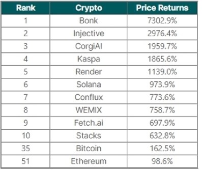 2023 年排名前 10 的加密货币涨幅(比特币和以太坊)的价格回报为: