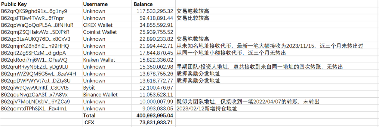 作为 PoS 类型公链,MINA 代币会拥有比较高的质押比例,这也就意味着二级市场流通的代币会相对较少。排名前 15 地址中仅能暂时判定为独立个人地址的代币持仓占比仅为 4% 左右。