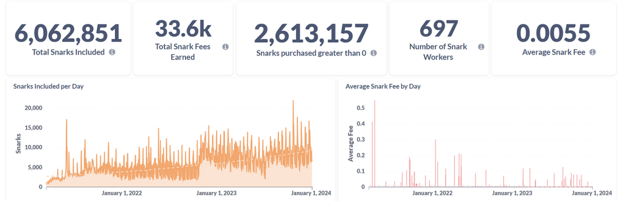 从 snark 证明生成数量来看,与网络交易活跃度基本保持一致。Snark 费用以 MINA 代币形式支付,从日交易平均费用来看,主网启动初期,MINA 代币价格较高,所以即使在 snark 证明生成数量较少的情况下仍然保持比较高的费用,在 2022 年度则随着代币价格的回落,日平均交易费用也在减少及降低。近期随着网络交易的活跃,日交易平均费用略有提升。