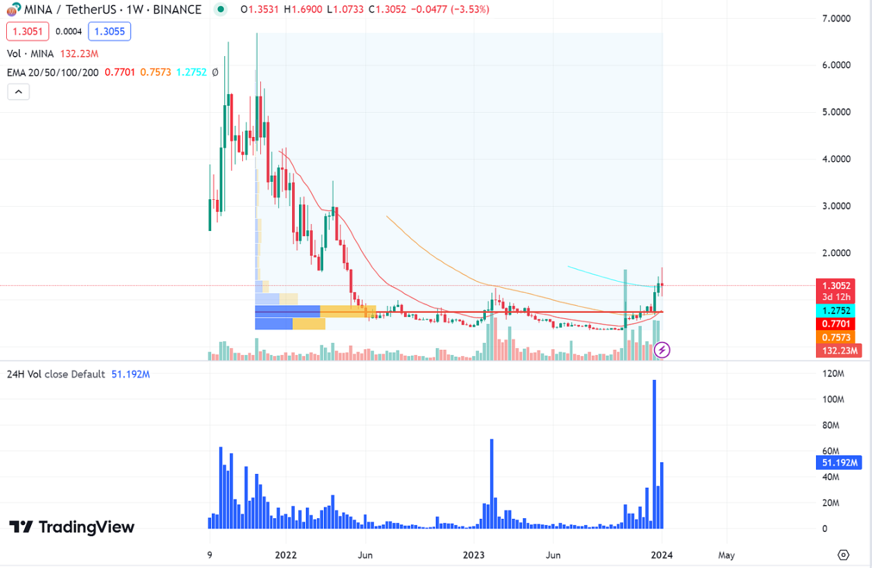 从目前的市场表现看,MINA 代币已接近全流通,代币价格已突破 23 年 2 月份高点以及历史筹码集中区,上方空间阻力较小。