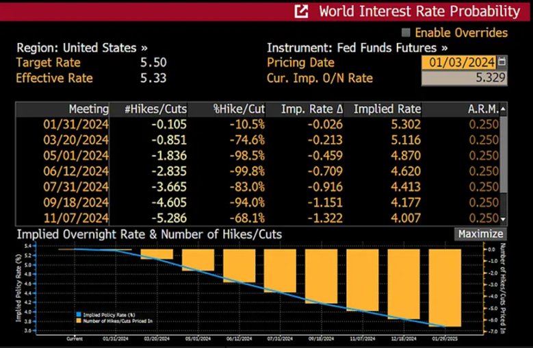 这是一个联邦基金期货的表格,暗示未来美联储会议加息的可能性。正如你所看到的,截至 1 月 3 日,市场预计降息 0.25% 的可能性为 75%。