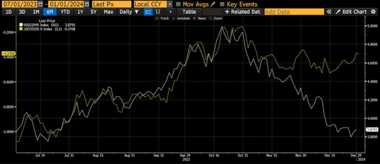 白线是 10 年期国债,黄线是 10 年期和 2 年期国债收益率之差。正如你所看到的,收益率在 10 月底见顶时走势趋陡,这意味着白线和黄线同时上涨。11 月初开始了恶性的债券做空挤压,收益率暴跌。