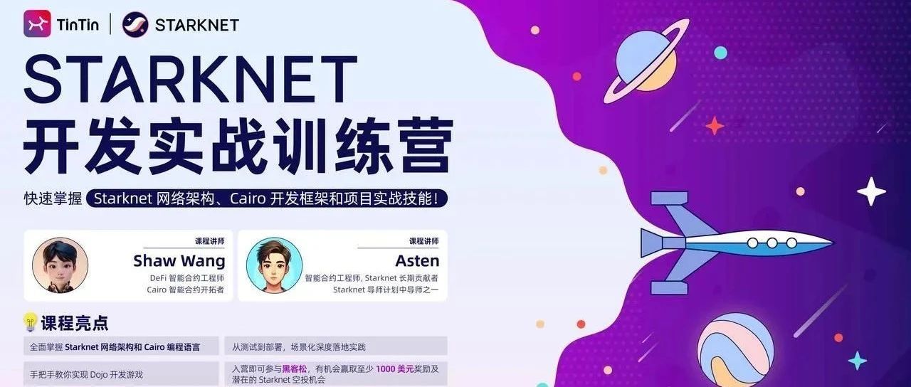 为了帮助开发者更好掌握 Starknet 生态项目部署与场景化开发本领,本期开发实战训练营将带领开发者学习 Starknet 网络架构和 Cairo 编程语言、深入探究 Dojo 开发游戏的建设奥秘,以把脉技术最前沿的姿态进入 Starknet 世界!以下为本次课程亮点(包含但不限于):