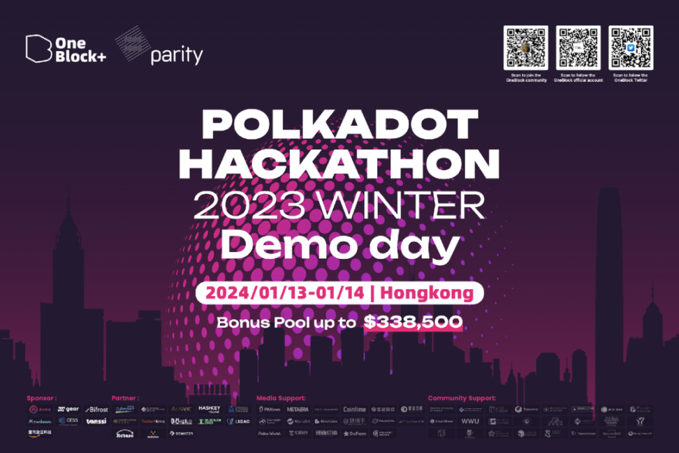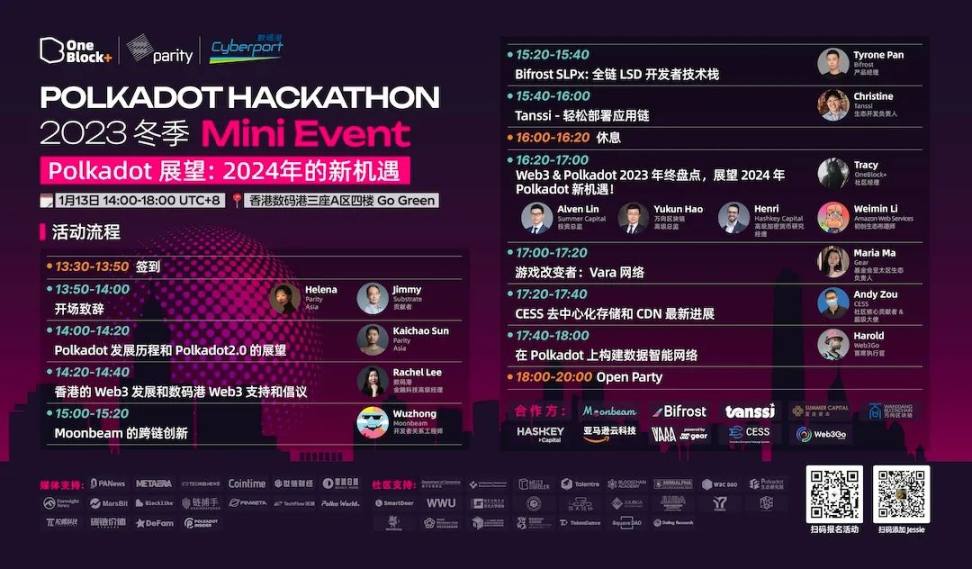 1 月 13 日 - 1 月 14 日,我们将在香港共同见证全新的波卡生态潜力项目诞生,也将在香港发出对 2024 年 Web3 行业与 Polkadot 生态发展的憧憬与期盼。
