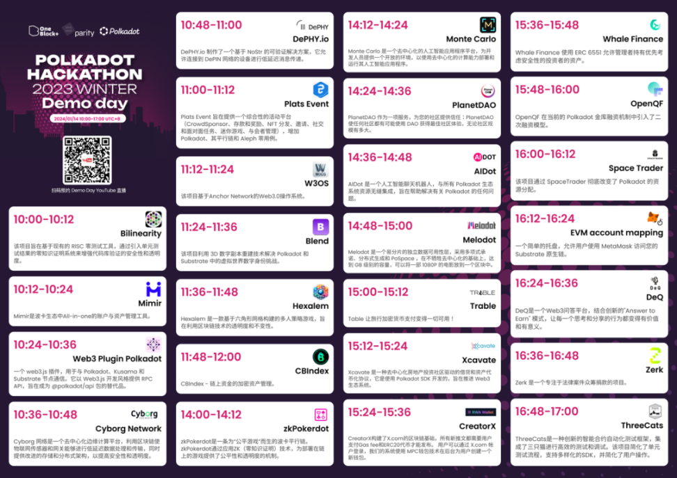 如果你是考虑踏入 Web3 行业的开发者,期望从 2023 冬季波卡黑客松大赛项目路演中获取更多 Web3 项目开发灵感;如果你是寻找 Web3 潜力初创项目的投资人士,希望透过大赛把脉值得投资的新星项目……那就千万不要错过 1 月 14 日香港线下决赛 Demo Day 的路演现场!让我们一起捕捉 2024 全新的开发创业灵感,找到更多值得 Pick 的行业发展风向吧!