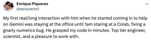 没想到的是,这条质疑的评论刚发布后没多久,不少知情的 Google 内部员工出面为布林“正名”。一名 DeepMind 员工表示,“论文中的名字顺序是随机的(除了前六个拼写为“Gemini”的名字)时,情节变得更加复杂。谢尔盖基本上每天都和我们在一起,经常结对!”另一位谷歌 DeepMind 高管 Enrique Piqueras 也回复道,「当他开始为 Gemini 提供帮助时,我与他的第一次真正 / 长时间的互动是在办公室呆到凌晨 1 点,盯着 Colab,修复了一个棘手的数字错误。他在几分钟内就掌握了我的代码。顶级工程师、科学家,很高兴与您合作。」凭借热情,布林在 Google 需要的第一时间便选择了回归技术。而作为技术人,布林无疑也是极具领导力的典范。还有人评论道,「一旦爱上了代码,此生离不开 Bug」,要是没有布林,或也不会有如今的 Google。最后,即使有钱如布林这样的亿万富翁依然在手搓代码,我们还有什么理由不努力。参考来源: