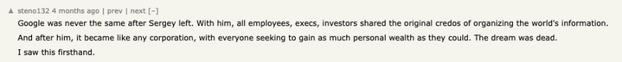 谢尔盖离开后,谷歌就不再一样了。之前所有员工、高管、投资者都与他分享了组织全球信息的最初信条。在他离开之后, Google 变得像任何公司一样,每个人都试图获得尽可能多的个人财富。梦想已经死了。我亲眼目睹了这一点。通过提前退休,布林让谷歌这个还不成熟的组织彻底被董事会压垮了。我曾经在那里工作过,他离开后文化迅速发生了变化。首先是 TGIF 的取消,这是每周一次的会议,拉里和谢尔盖过去在 1600 Amphitheatre Pkwy 现场现场回答一些你能想象到的最政治敏感的问题,其次是首席财务官露丝·波拉特 (Ruth Porat) 的规则,他取消了许多人的职位。另一边,布林和佩奇卸下了重担,日子过得风生水起。其中佩奇去了私人岛屿上隐居,布林成了“派对动物”( 指经常参加派对的人 ) 的同事,也在致力于自己实验性的飞艇创业公司和慈善等事业。不过,作为 Alphabet 董事会成员,当 Google “有难”时,他们还是会第一时间出现。就在“半退休”的三年后,Google 在 2022 年就遇上了前所未有的一难——OpenAI 发布了 ChatGPT。彼时 CSDN 也曾报道过,ChatGPT 的横空出世,让 Google 内部警铃大作,《纽约时报》指出,Google 甚至其在内部为此拉起了一道「红色代码警戒」(Code red),担心 ChatGPT 将对 Google 搜索引擎的未来带来巨大挑战。也就是在那时起,Google 内部邀请回了初代创始团队布林和佩奇。根据《福布斯》报道,今年 1 月 24 日,布林提出了访问该公司自然语言聊天机器人 LaMDA 相关代码的请求。彼时有一位看到该请求的人士表示,布林提交了一份“CL”(“变更列表”的缩写),以获取训练 LaMDA 的数据。该人士表示,只需对配置文件进行两行更改即可将他的用户名添加到代码中。数十名工程师批准了 LGTM 的请求,即“我觉得不错”的缩写。该人士补充说,其中一些批准来自该团队之外的工作人员,他们似乎只是渴望能够表示他们已向公司联合创始人授予了代码审查批准。04