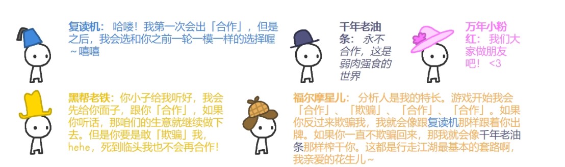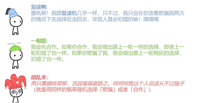 - 复读鸭:与复读机机制相似,但只在连续被欺骗两次时,才开始复制对手策略