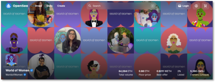 最近两年,女性内容也一直渴望能在 Web3 世界中占据一席之地。最出名的要数 NFT 作品《World of Women》,这个由中东艺术家 Yam Karkai 手绘的女性头像 NFT 组合于 2021 年 7 月推出,上线后 10 小时内,总量 1 万的这款 NFT 售罄。