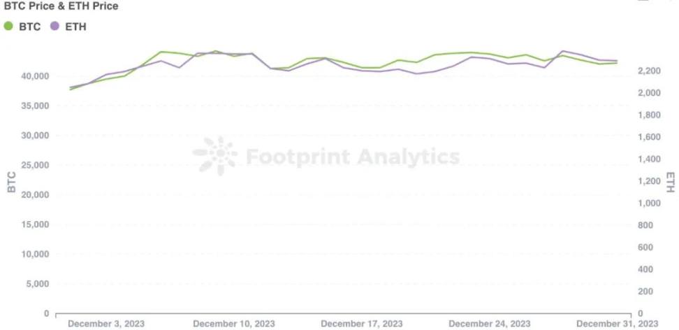 12 月比特币的表现十分亮眼,月初价格为 37,729 美元,月末收于 42,171 美元,涨幅达到了 11.8%。以太坊也呈现出类似的上涨趋势,从 2,052 美元开始,最终收于 2,293 美元,涨幅为 11.7%。