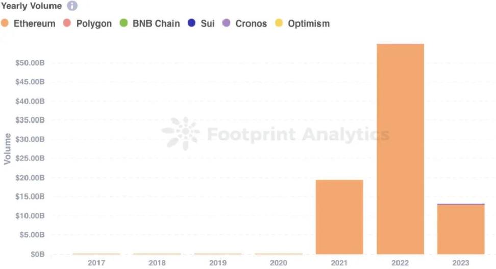 宏观趋势来看,2023 年 NFT 市场交易量为 131.2 亿美元,较上一年的高点有所下降。以太坊的市场份额略微下降至 97.8%,低于 2022 年的 99.8%,这表明市场正在逐渐走向多样化。